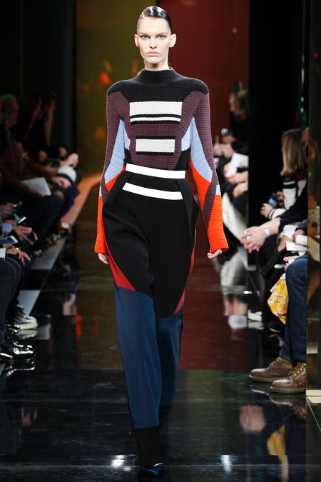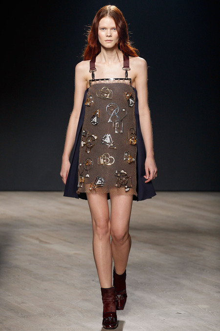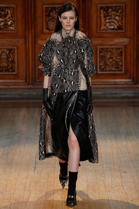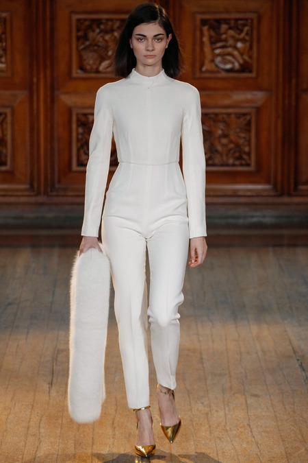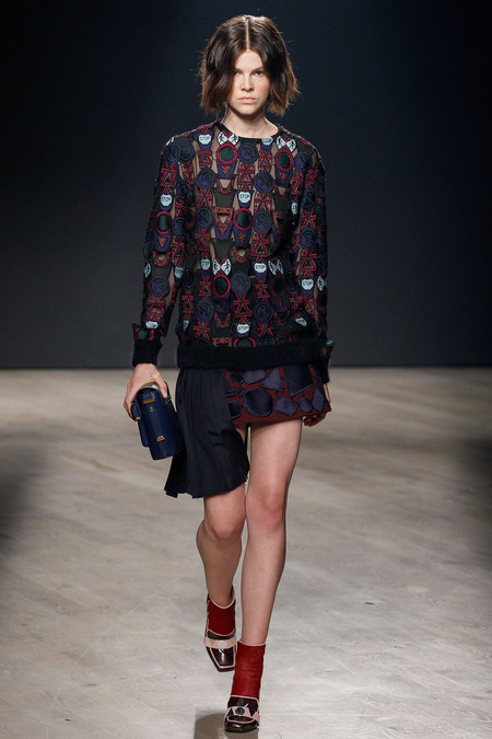 On the luxury front, we were delighted to see an increased focus on eveningwear. Oscar dresses, perhaps? Christopher Kane trimmed his black nylon dresses with mink; Matthew Williamson, with his black feathered dress, created one of his most expensive dresses ever; Tom Ford, who we have come to expect luxury from, kept the bar high with those decadent fox coats in bright colors; Mary Katrantzou, London’s print queen, showed a collection void of her signature, eye-popping prints and instead, focused on ultra-luxe embellishments, laces, and jacquards. (We would love to see a leading lady dare to rock one of those Katrantzou’s metallic suits at the Oscars instead of a classic gown.) Even Meadham Kirchhoff, a label known for its cheeky and oftentimes wild runway shows, leaned towards decadence this season. Clothes were full of beautiful, hand-done details that were much prettier than in the past seasons. It was a play towards the commercial side of this business, no doubt, but also a major moment for the brand.